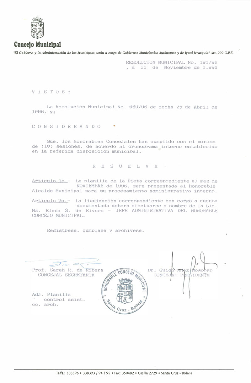 La Planilla de la dieta correspondiente al mes de NOVIEMBRE de 1996. sera presentada al Honorable Alcalde Municipal para su procesamiento administrativo interno.