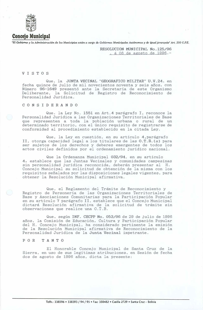 Anula la Resolución Municipal No. 112/95 y aprueba la rectificación de la Junta Vecinal “30 de Agosto” U.V. 124.