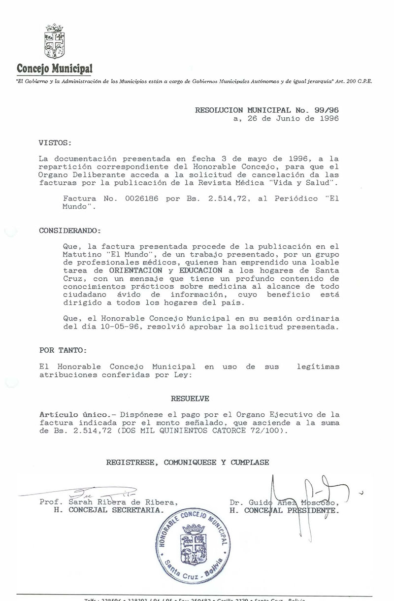 Dispone el pago por el Ejecutivo Municipal de las facturas del Periódico El Mundo, por la publicación de la Revista Médica “Vida y Salud”.