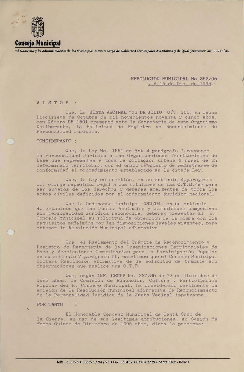 Aprueba el Registro de la Organización Territorial de Base, JUNTA VECINAL “13 DE JULIO” U.V. - 161.